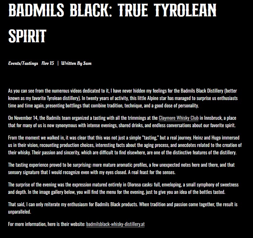 Bericht zum Tasting im Claymore Club 16.11.2025 06:36 samsmoonshinercrew.com/news/badmils-black-true-tyrolean-spirit